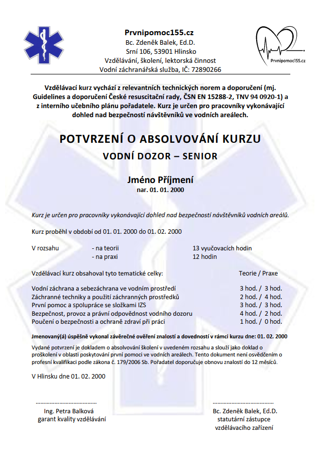Výstup z kurzu - Potvrzení o absolvování kurzu Vodní dozor – senior