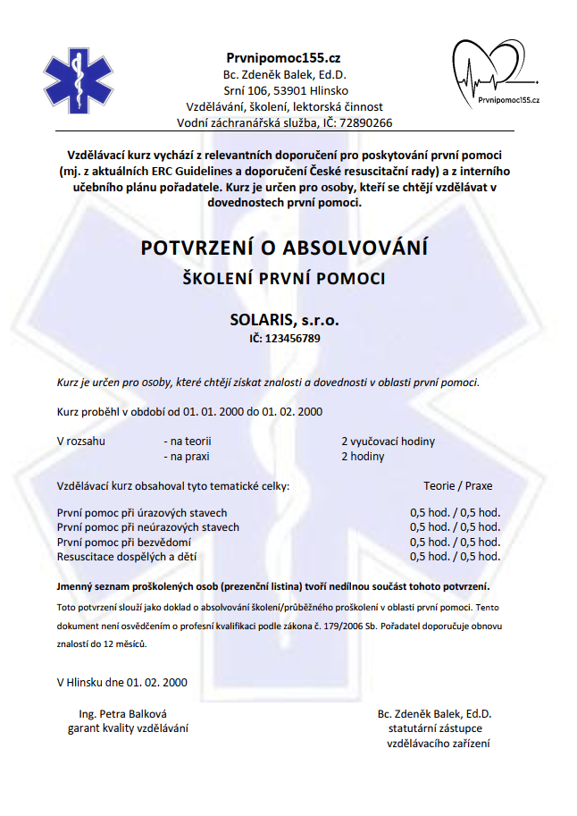 Proškolením svých zaměstnanců zaměstnavatel zároveň naplňuje požadavky předpisů České republiky. Zejména zákon č. 262/2006 Sb., zákoník práce (§ 102), ukládá zaměstnavateli povinnost zajistit zaměstnance vyškolené k poskytování první pomoci a k organizaci pomoci při mimořádných událostech.